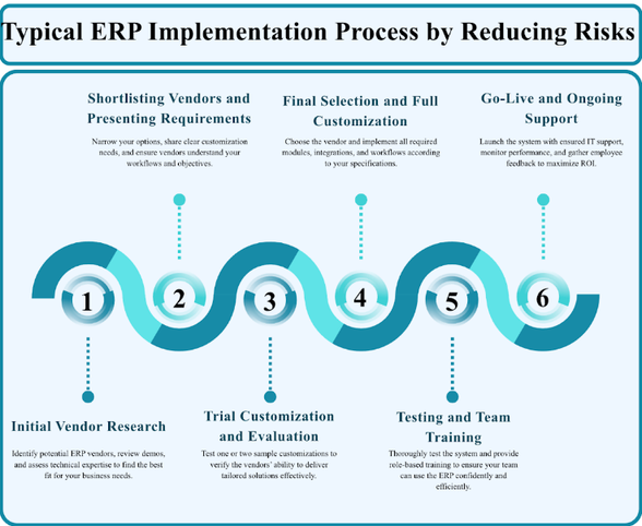 - Initial Vendor Research: Start by identifying potential ERP vendors that align with your business needs. Schedule meetings, request demos, and evaluate each vendor’s team qualifications. Involve your IT personnel to assess technical expertise, system capabilities, and prior project experience. The goal is to understand which vendors are capable of meeting your unique requirements.